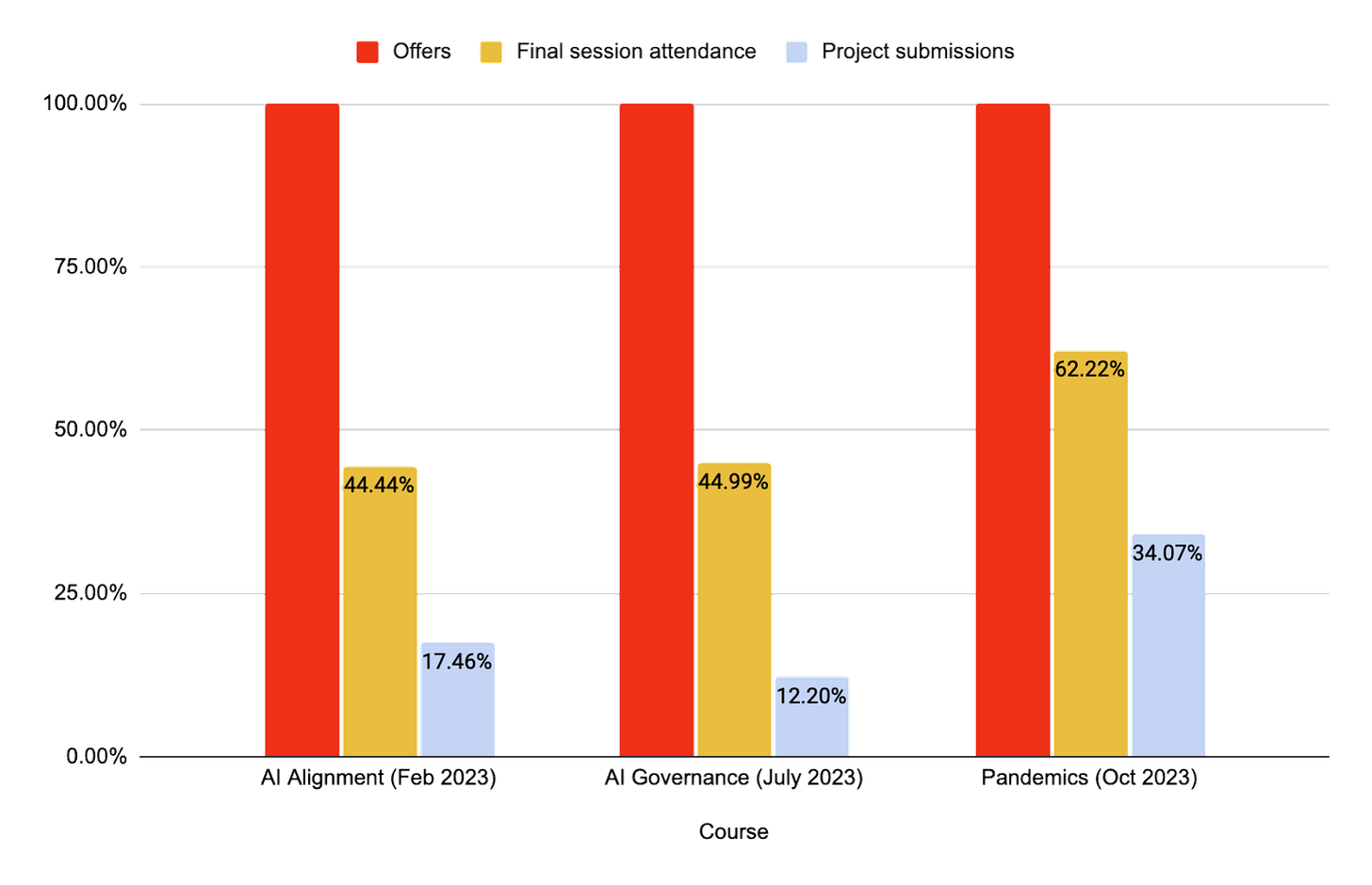 By the end of the year, we’d redesigned the AI Alignment course and designed new AI Governance and Pandemics courses, all using findings from the science of learning. We developed a cohesive design language for our separate brands and built new websites for each of them. Our new Course Hub hosts the courses, and students can tick off resources when they complete them. We built a custom video conferencing solution to track session attendance and provide each cohort with a unique link and meeting room. Our cohort switching tool fully automated the cohort switching process, updating the records on our back-end and adding people to new Slack channels and calendar events. The project sprints went from totally unstructured and not helpful during the Feb 2023 AI Alignment course to facilitating significant collaboration and high-quality project work during the Oct 2023 Pandemics course. We can now launch a new course every month instead of every 4-5 months, each course is a better experience for students, all while having the same number of team members.