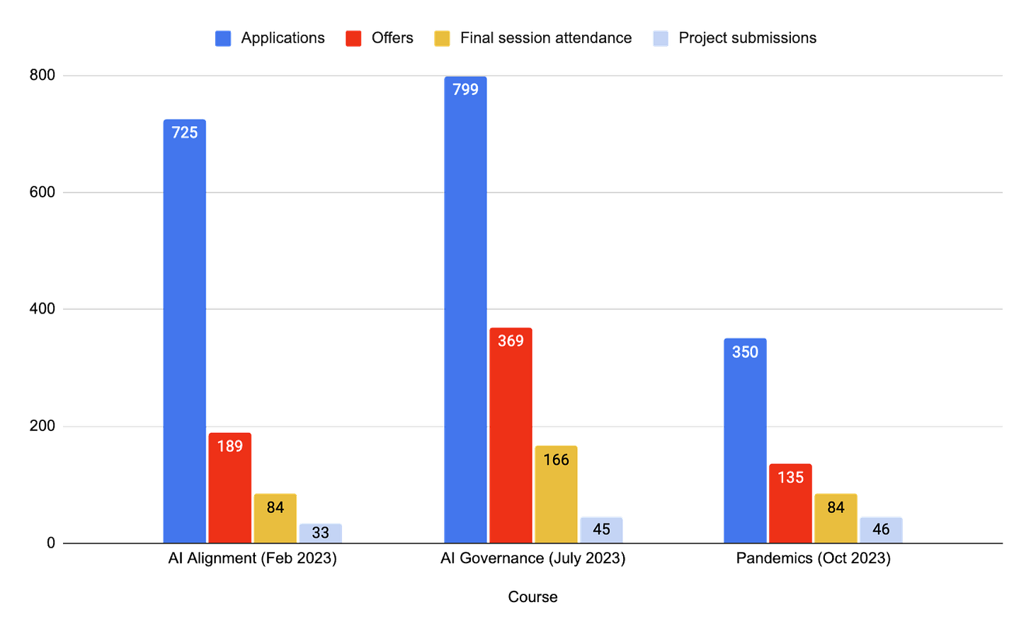 Since 2022, over 2,000 people have graduated from our AI safety courses, including individuals at major AI companies, top universities, and relevant governments. In 2023, we also ran a pilot Biosecurity Fundamentals: Pandemics course with 100 medical, public health and synbio professionals from across the world.