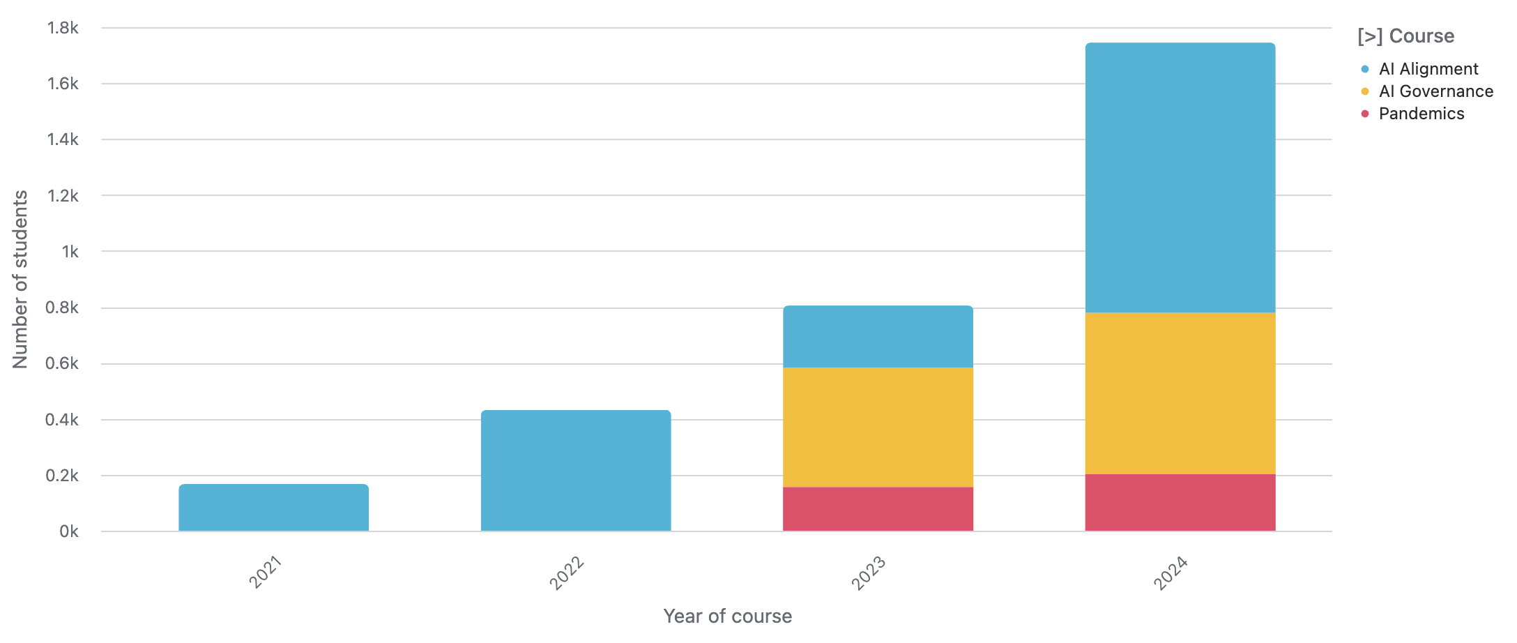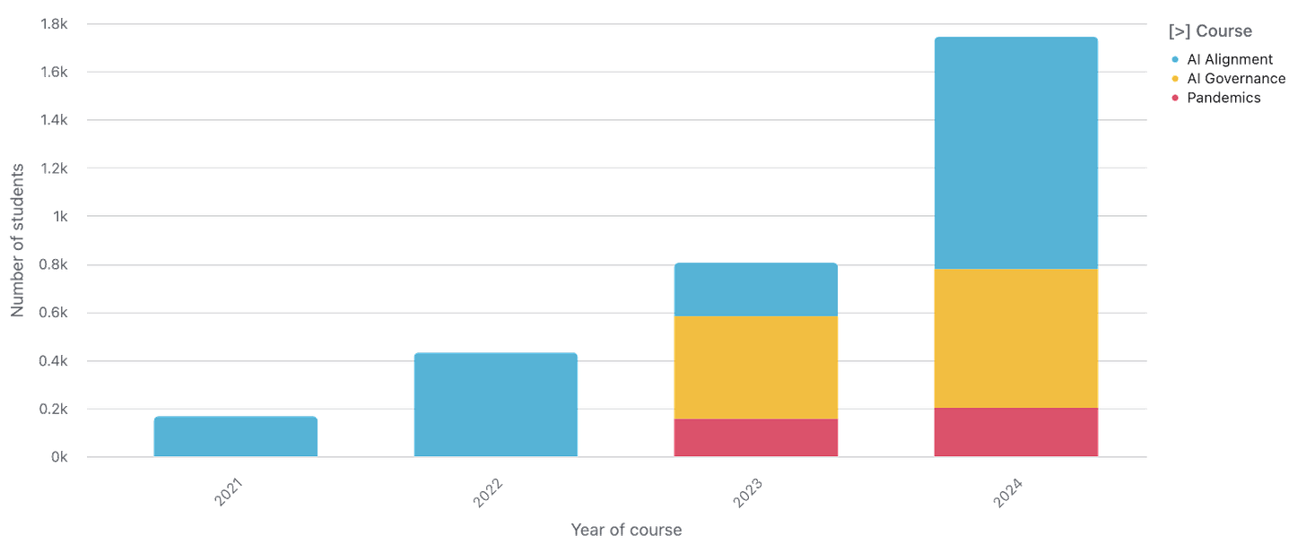 Throughout 2025, we’ll leverage the capability we’ve developed to design and run high-quality courses at scale. We’ll build partnerships with influential organisations to identify topics where new courses would be impactful, we’ll work with subject matter experts to design those courses, and we’ll use the reach of the partner organisations to raise awareness of the courses among influential decision-makers. We anticipate designing 5-10 new courses in 2025. Tentative course ideas include cybersecurity for AI companies, technical AI governance, deep dives on specific biosecurity proposals, and pandemic preparedness policy.