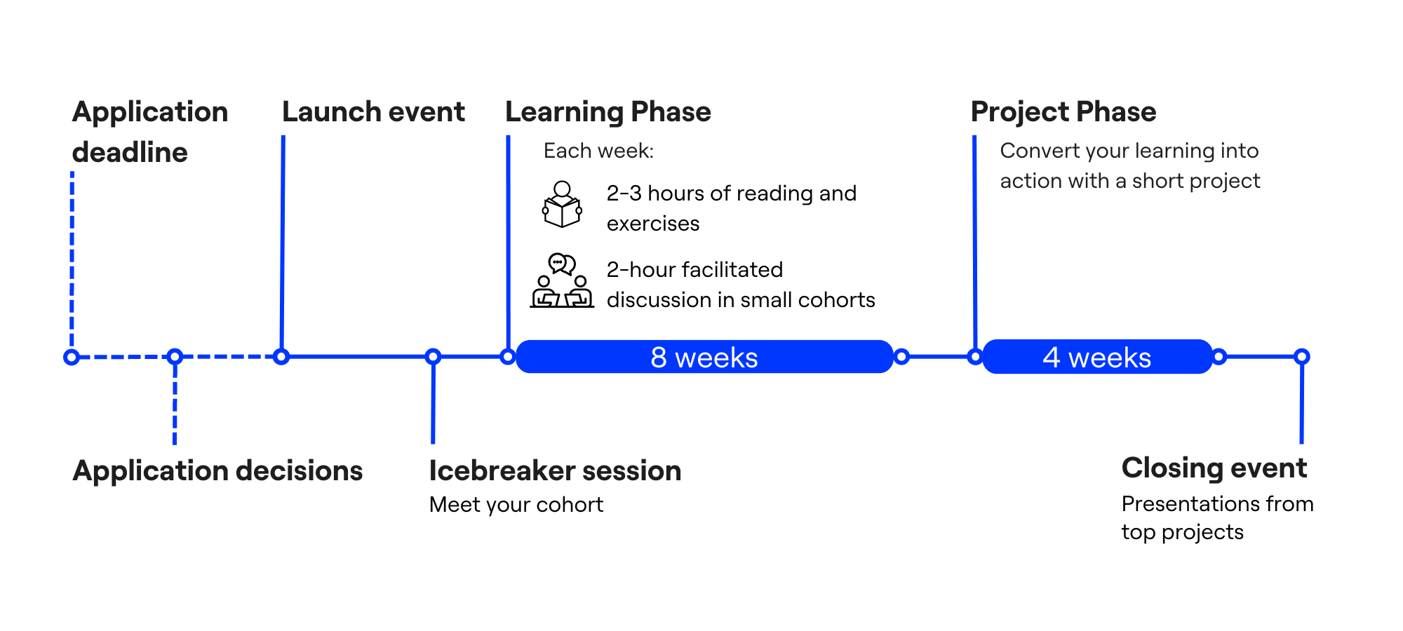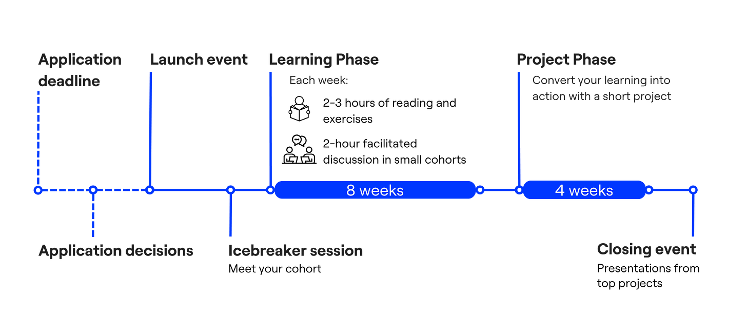 During the Learning Phase, students spend 8 weeks reading, completing exercises, and attending weekly sessions. The resources are developed in collaboration with subject matter experts, the exercises help students think through the content further, and the sessions provide an opportunity to learn from others. Each student is assigned to a cohort with 5-8 other students, meeting once a week to be guided through the session activities by an expert facilitator. The activities include role-plays, case studies, debates, and open-ended discussion.