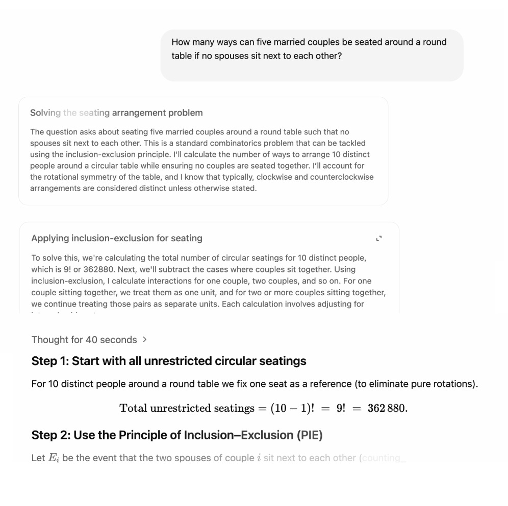 Some LLMs, such as OpenAI’s recent series of “reasoning models” are specifically trained to use CoT reasoning when responding to user queries. The CoT is partially revealed to the user through model-generated summaries. Here’s OpenAI’s o3, a model trained to use CoT reasoning, displaying two CoT summaries to the user before arriving at a final answer after 40 seconds: