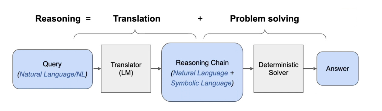 We feed this reasoning chain into an external deterministic solver. A deterministic solver is a programme that follows exact rules to turn an input into an output, such as a Python or Datalog interpreter. It is guaranteed to always produce the same output for a given input.