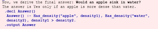 Our deterministic solver executes the code generated during the translation phase and outputs a final answer. In the apple example, the LLM generates code specifying that the answer will be “yes” if an apple is more dense than water. Executing this code allows the deterministic solver to output an answer of “no”: