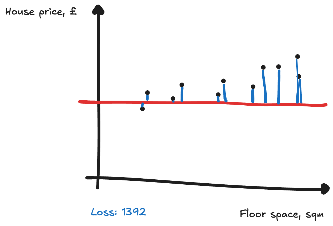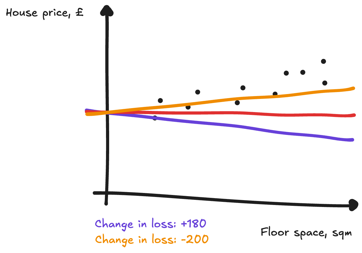 To find the parameters, you can use trial and improvement.[[1]] Perhaps you start by picking some numbers at random for our parameters, and see how well it does. To calculate how good it is, you can add up how far away the points are from the line. This measure of how far away we are is the loss, and you’ll want to decrease this (so the line is closer to the points).