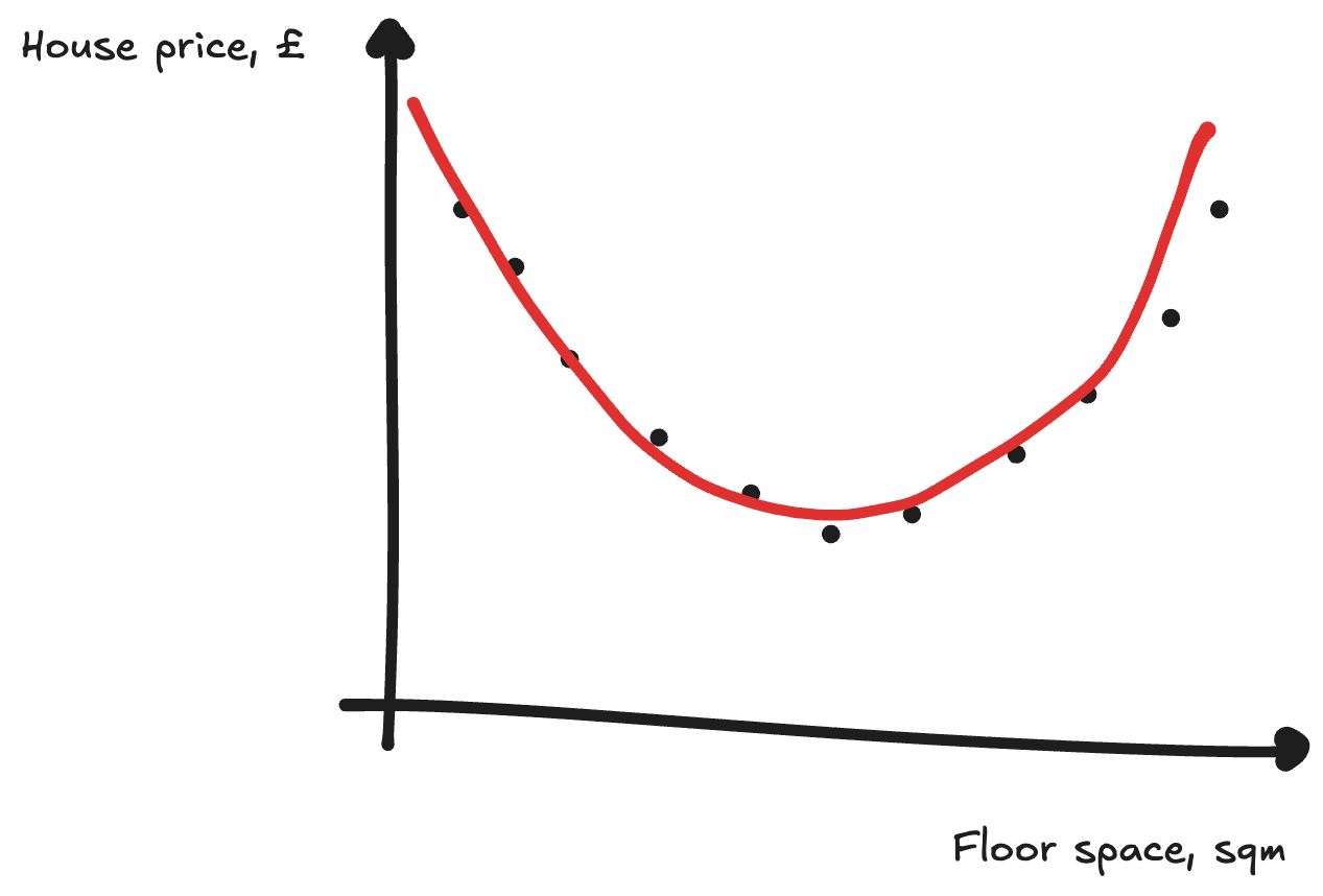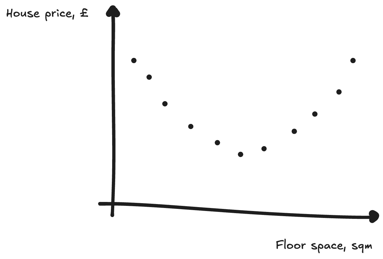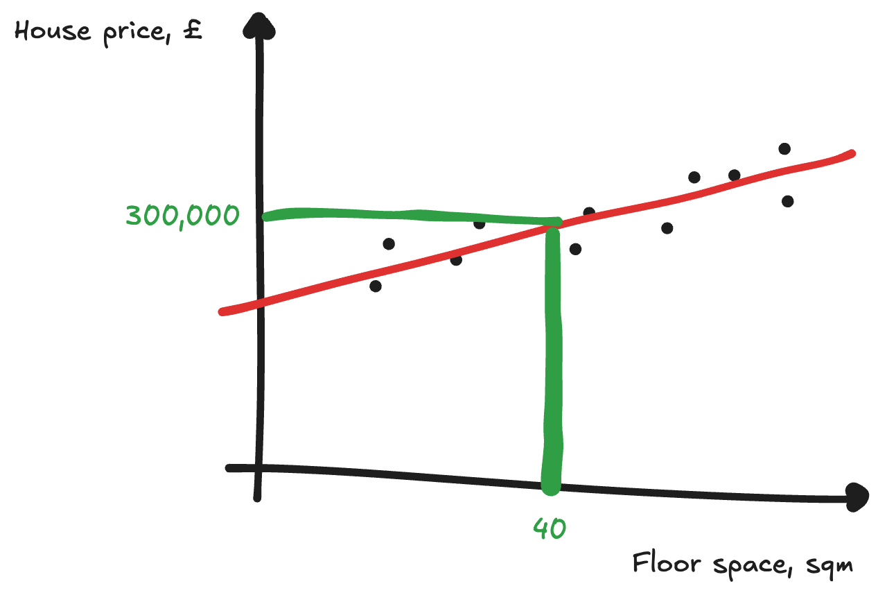 We can then also see how new houses should be priced. For example, a house of 40 sqm is worth roughly £300,000 with the line of best fit.