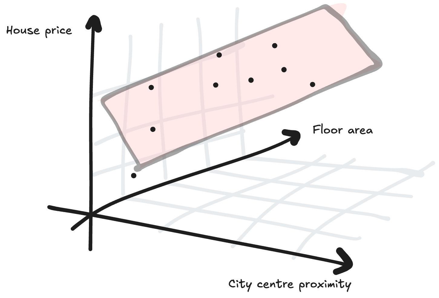 For example, if we had an extra data point about how far the houses were from the city center we could imagine plotting a 3D graph, instead of a 2D one, and drawing a plane of best fit: