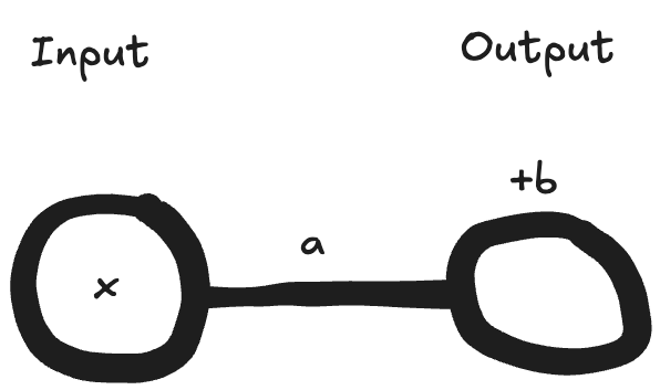In our simple case above, the equation is actually the same as our line from earlier! The weighted sum of the inputs is our weight (a) times the activation (x), and the bias (b) is a constant, so. Output = ax + b.