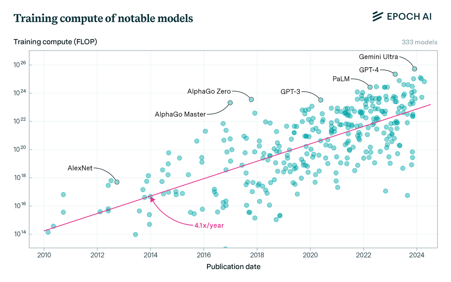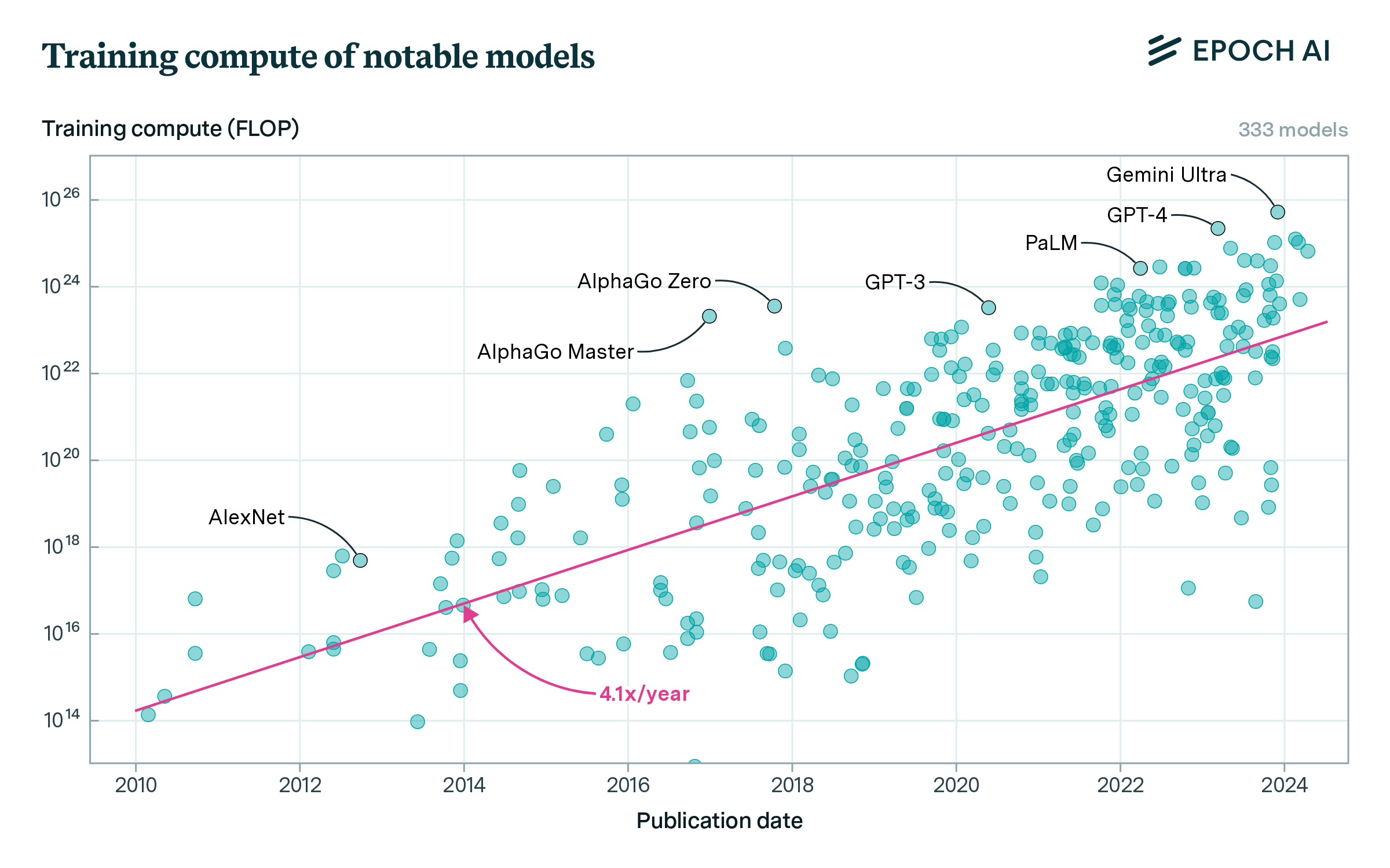 Chart: Training compute of notable models has increased by ~1,500,000,000x from 2010 to 2024. Source: Epoch AI, licensed under CC-BY.