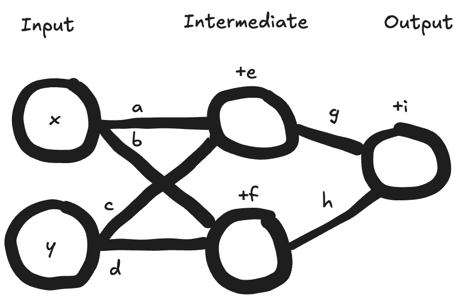 Let’s look at an example with 2 neurons in the input layer, 2 neurons in an intermediate layer, and one output neuron: