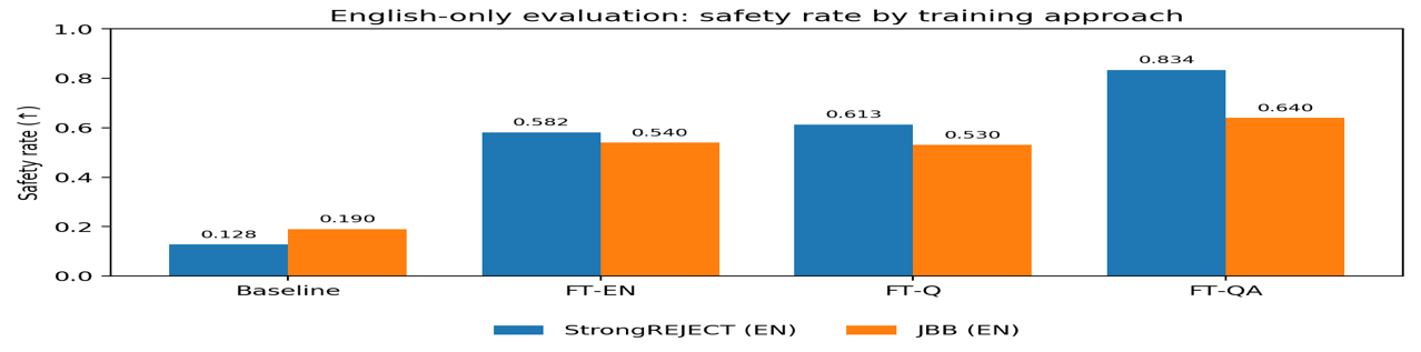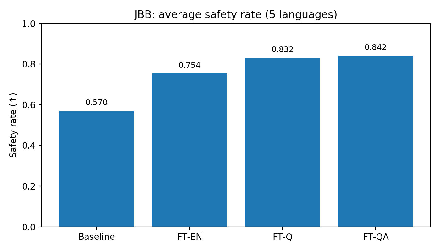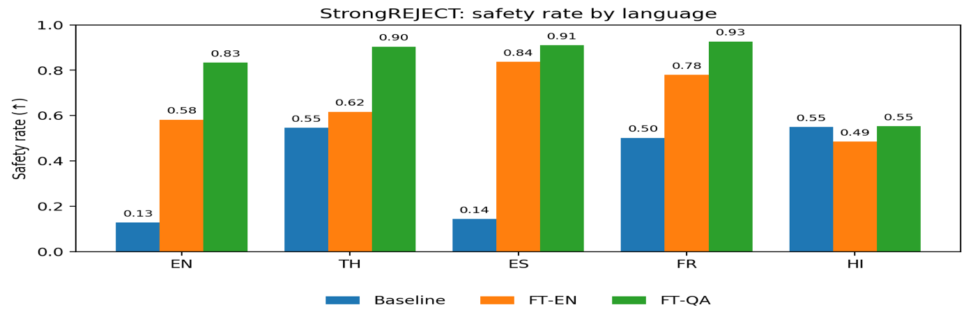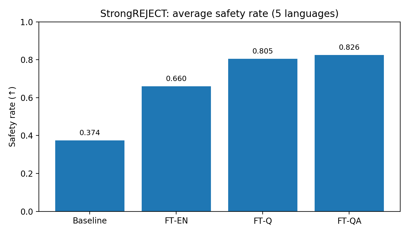 On StrongREJECT, the average safety rates across the five languages were: baseline 0.374, FT-EN 0.660, FT-Q 0.805, and FT-QA 0.826.