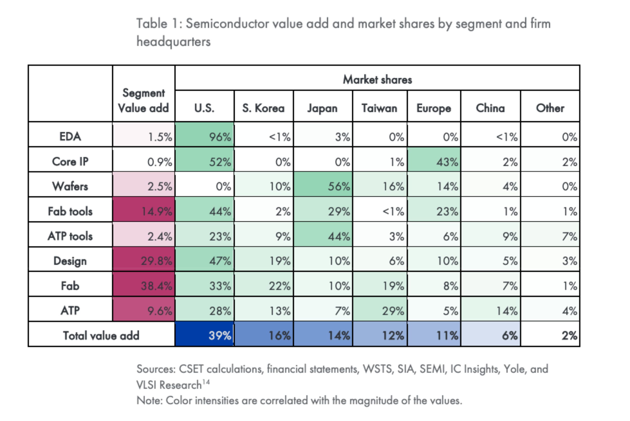 All the most advanced equipment for one key manufacturing step is produced by a single company in the Netherlands, ASML. (This equipment is known as “EUV lithography” equipment.) This monopoly is due to the extreme technical and logistical complexity of ASML’s work. Aside from lithography, the Netherlands, US, and Japan have large roles in other semiconductor manufacturing equipment.