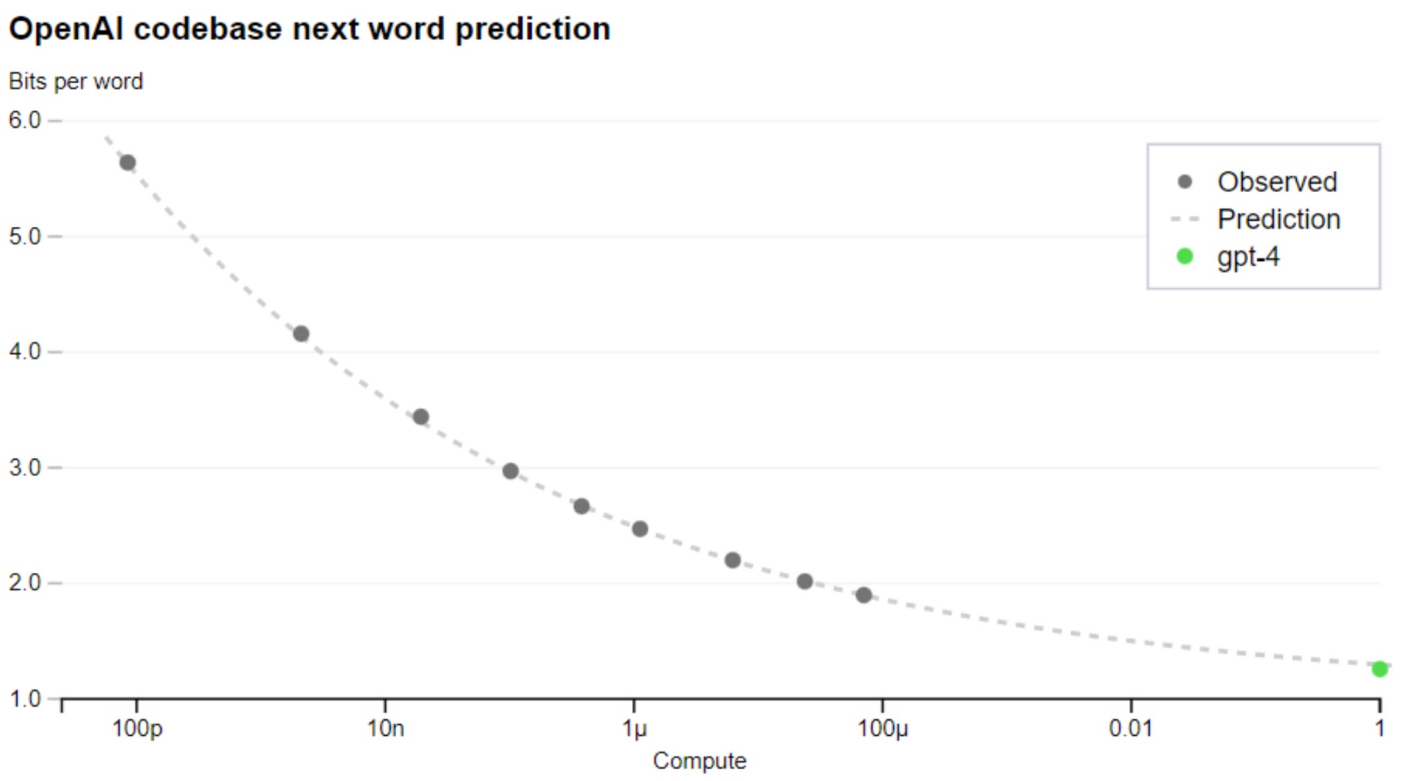 When an AI model is trained with more compute, it tends to have more advanced capabilities. For example, an AI model trained with more compute tends to be more successful at predicting the next word in a sentence, or better at achieving high scores in games. These trends are so consistent that they have been used to make verified predictions, and they can be described mathematically by what are known as “scaling laws.” (However, it is unclear how far “scaling laws” will generalize, and their numerical predictions can be difficult to interpret qualitatively.) A visual example of a scaling trend is the following graph, from OpenAI, which shows prediction errors decreasing as compute increases: