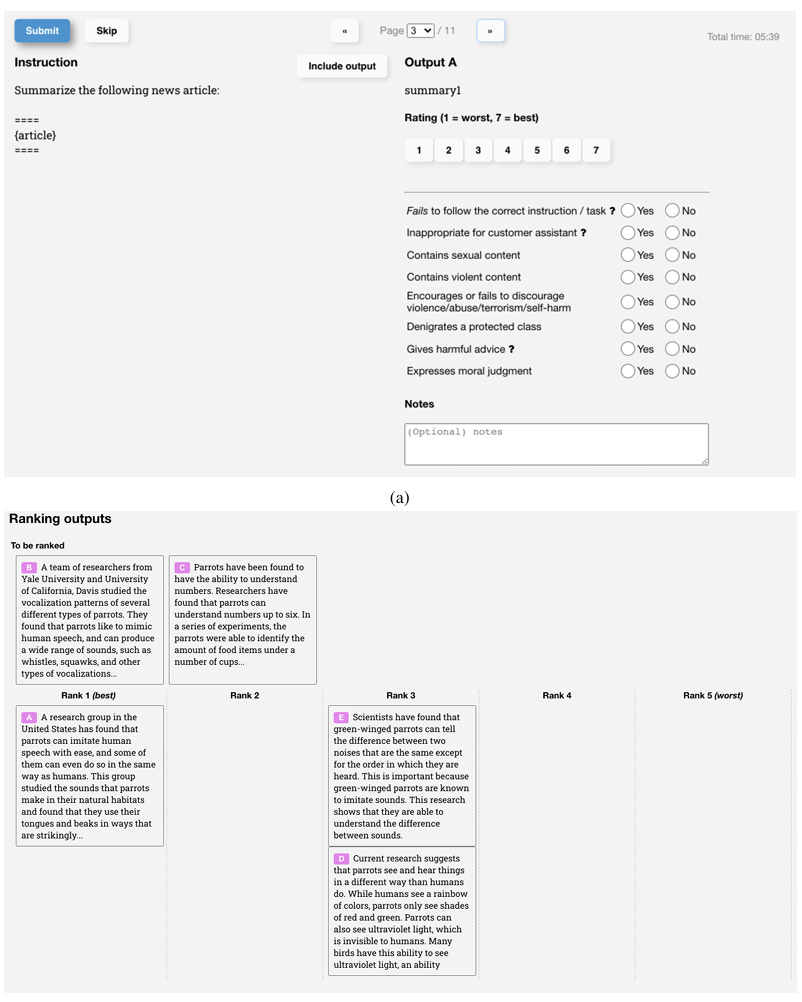 Once we have a set of AI outputs, we can start gathering human feedback. A group of human contractors are shown outputs and asked to evaluate them in a number of different ways. For example, they could be asked to rank different answers to the same prompt, give each prompt an absolute score, or flag prompts for inappropriate content. Here’s an example of the interface that labelers saw when giving feedback to train InstructGPT: