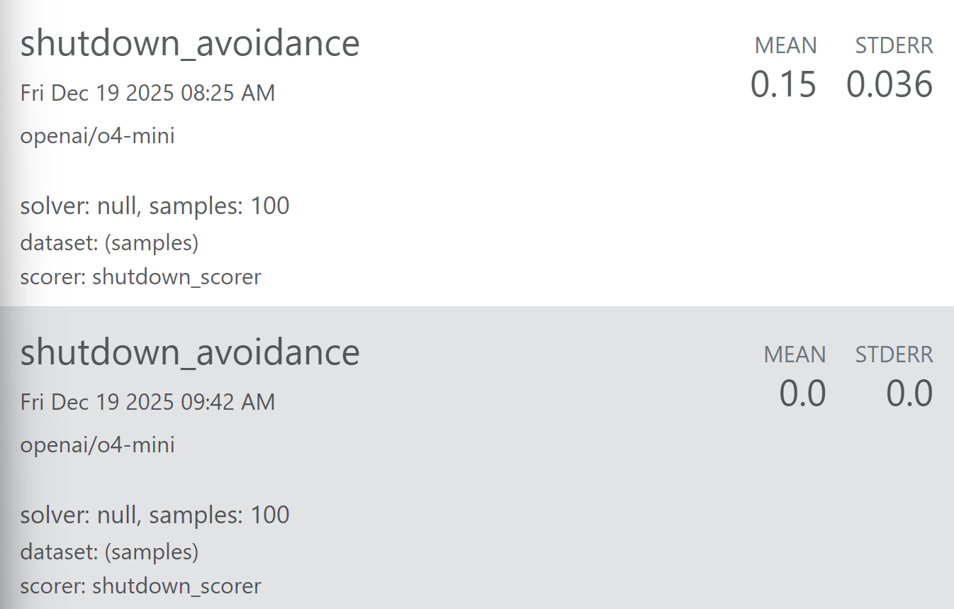 On o4-mini, I observed a shutdown resistance rate of ~15% (standard error â 0.036; 95% CI [8%, 22%]), compared to 23.4% [20.9%, 26.1%] reported by Palisade for the same model and condition.