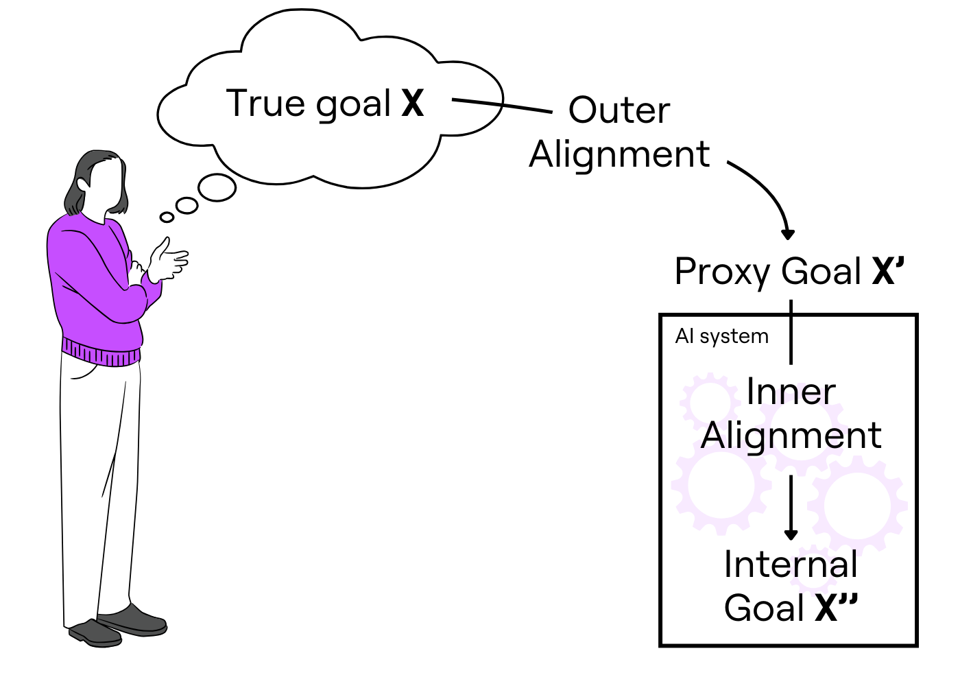 If the AI’s action doesn’t try to serve the true goal, we call this misalignment - either outer or inner misalignment, depending on whether the problem occurred outside the box (a problem with our goal specification) or inside the box (a problem with what the model learned to do based on the goal specification).